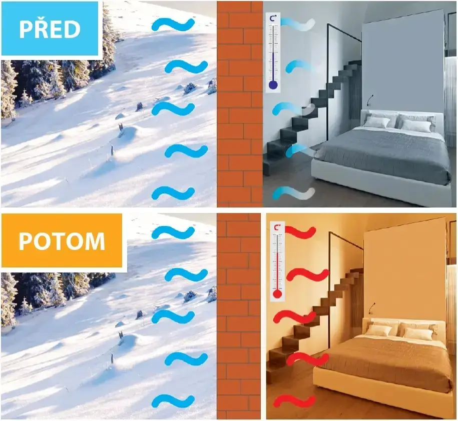 Znáte ten nepříjemný pocit chladu, když se opřete o zeď? Pro případy, kdy nelze použít klasické zateplení můžete využít tepelně izolační barvy a vyrovnávací stěrky, které navozují pocit tepla a zajišťují úspory energie. Tyto materiály obsahují speciální duté plnivo, které snižuje prostup tepla. Povrch plniva odráží teplo, plyn uvnitř tepelně izoluje. Využití je proto vhodné v prostorách, kde se často zdržujeme a kde chceme mít pocit tepla při dotyku s povrchem stěny.